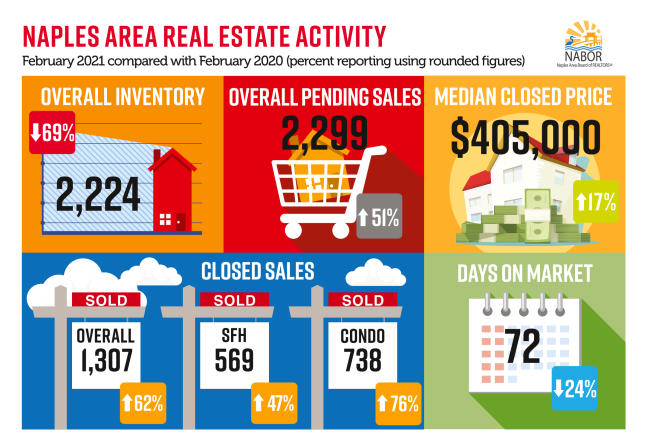 There’s a shortage of all types of inventory whether resale property or new construction. As a result we’re seeing an increase in cash purchases and cash sales were 57.9% of the closed sales in February. We’re seeing properties that are being listed and going under contract within a day or two especially in the most desirable areas. Condo sales are up as homeowners are downsizing to take advantage of the new values their homes have. The current Naples Florida real estate inventory is down 69% and pending sales are up 51%.
